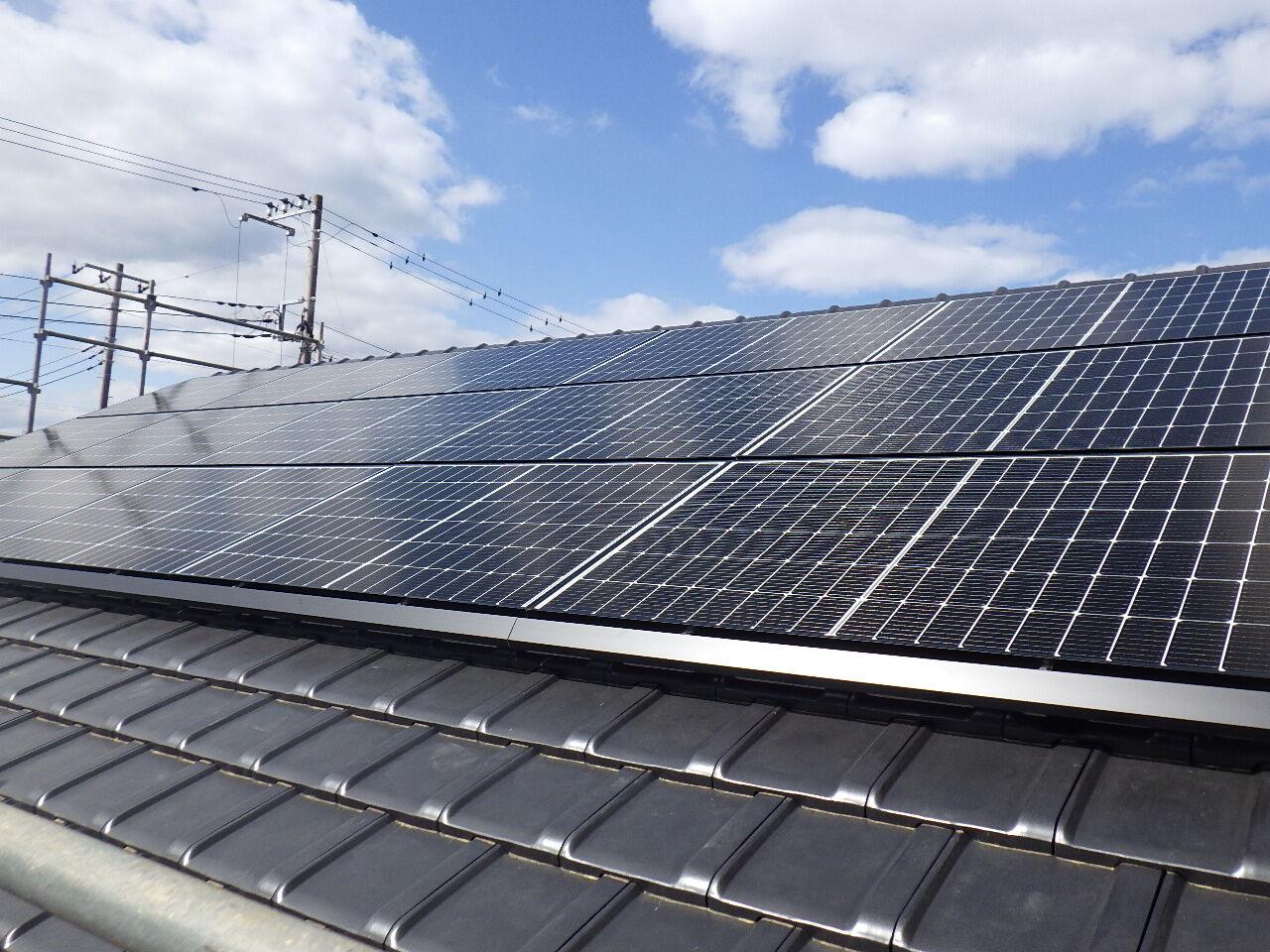 現場では太陽光パネルの設置が完了。屋根いっぱいに太陽光パネルを敷き詰め、効率よく発電できるシステムを導入しました。さらに、9.8kWの蓄電池も搭載予定で、創蓄連携によるエネルギー活用を実現します。
