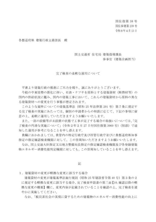 TOTOの受注停止からわずか数日、4月13日付で国土交通省から「完了検査の柔軟な対応」が発表されました。