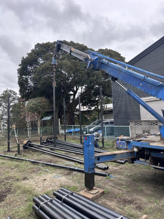 工事は、Σ-i(シグマアイ)工法による鋼管杭の地盤改良。