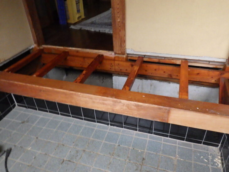 雨に濡れた靴、結露、外気との温度差など、家の中で最も湿気がたまりやすい条件が整っており、木材が湿気を持ちやすい環境でもあります。今回も床を解体してみるまで被害の全容は分かりませんでしたが、いざ開けてみると少し驚きの光景が広がっていました。