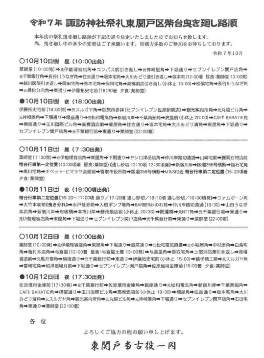 当社も例年どおり、東関戸区としてお祭りに参加するため、期間中は 本社・モデルハウスともに臨時休業 とさせていただきます。また、祭り区域内の現場もすべて休工となりますので、何卒ご理解ください。