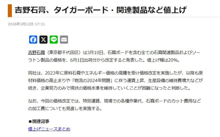 石膏ボードや断熱材の価格改定の案内が届き、住宅設備も少し前から値上げのアナウンスが続いてきています。