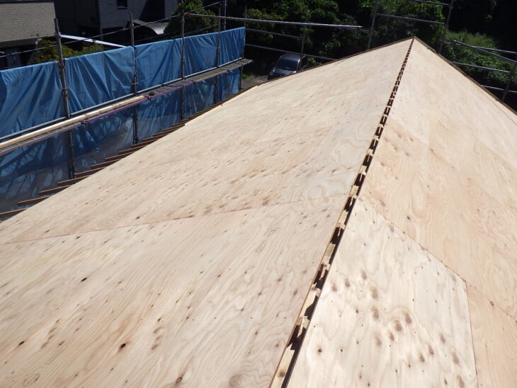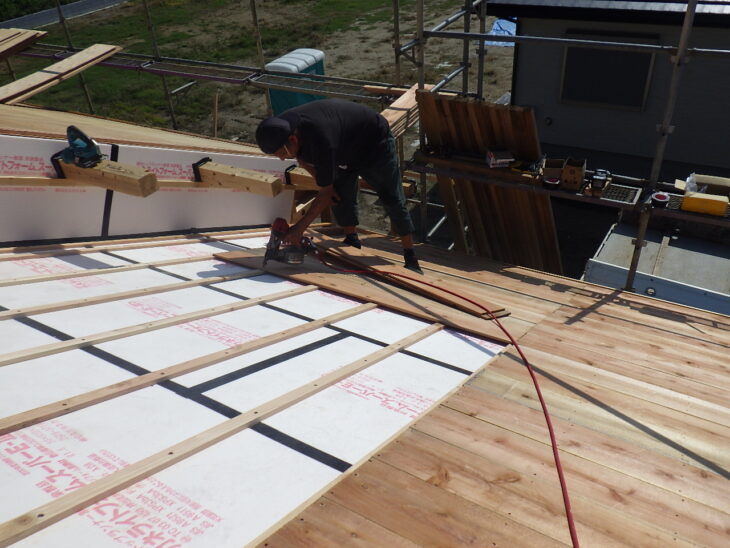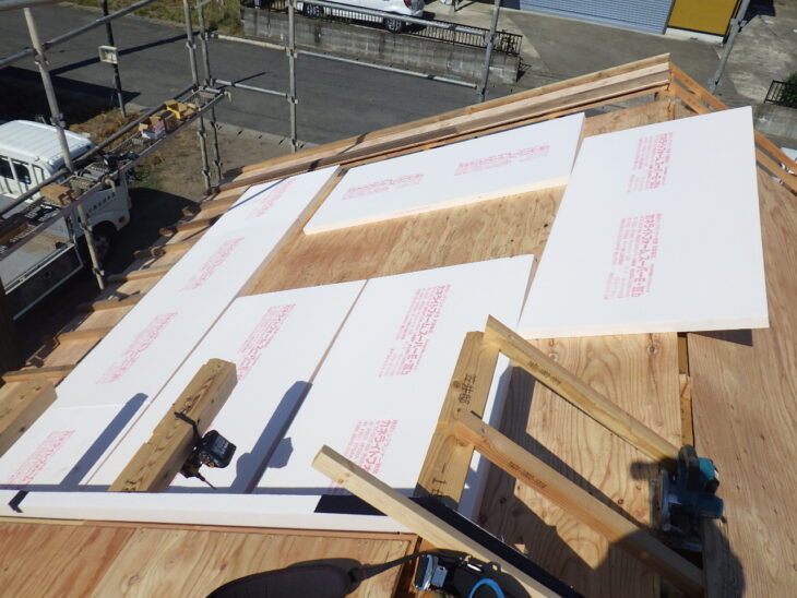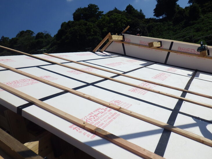一度、屋根垂木の上に野地板を張り、白い断熱材「カネライトフォーム」を丁寧に機密テープを張りながら敷き込み、さらにその上に通気層を設け、もう一層、屋根を重ねていく。