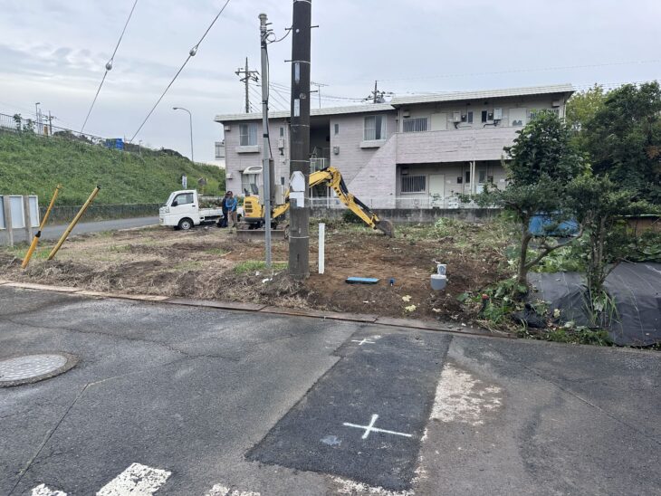 確認申請が下りるまでは、建築本体に関わる工事は行えないため、こうした外構・インフラまわりの工事から先行して進めていきます。