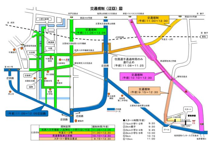 大会当日は、香取神宮をはじめ、佐原の中心市街地一帯で交通規制が行われます。