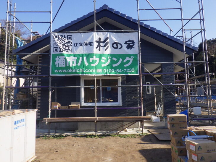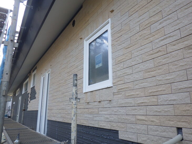成田市猿山で進行中の注文住宅「杉の家」平屋の現場では、外壁のタイル工事が着々と進んでいます。