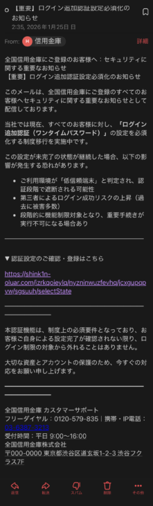 私のもとに届いたのは、全国信用金庫を装った「ログイン追加認証設定」というメール。