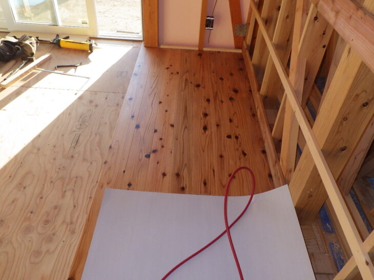 先日、キッチンの取付が完了し、室内では杉の圧密フロアの施工が進んでいます。
