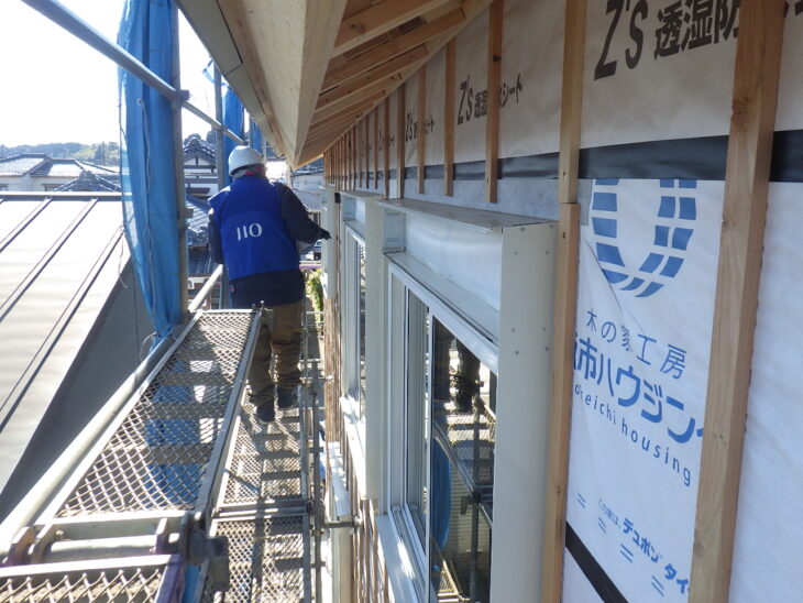 この検査は、外壁工事前の段階で、サッシまわりや屋根、ダクトや電線など外部への貫通部などの防水処理が正しく施工されているかを確認するものです。雨漏りリスクの高いポイントが適切に処理されているか、プロの目で厳しくチェックされます。検査はもちろん無事に合格。