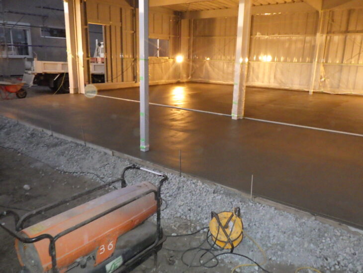 倉庫内へ向けて、ヒーターで内部の温度を一定以上に保ちながらの作業。深夜にも及ぶ過酷な環境下での作業となりましたが、万全の準備を整えた甲斐あって、コンクリートが凍ることもなく、とてもきれいに仕上がりました。