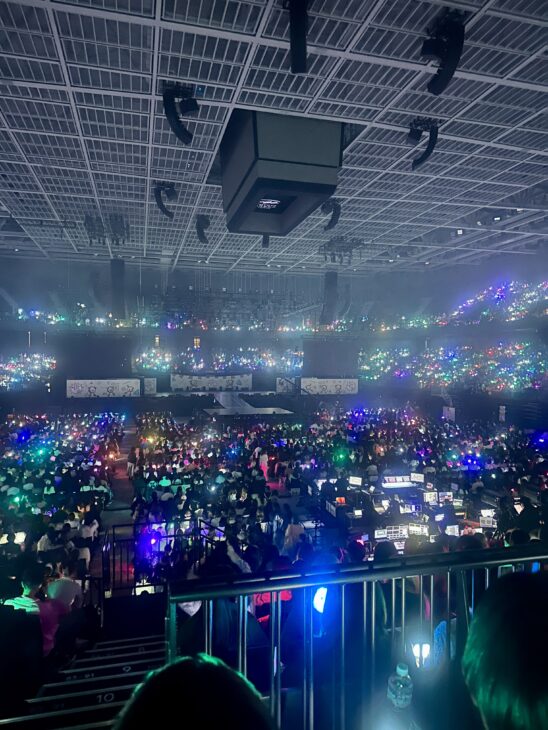 客席はペンライトの海で埋め尽くされ、色とりどりの光が波のように揺れる光景は圧巻!ダイソーで買ってこなかったことを悔いました…。それでもファンの歓声と照明演出、そしてアリーナ全体の一体感、これはテレビ越しでは絶対に味わえないライブの魅力!
