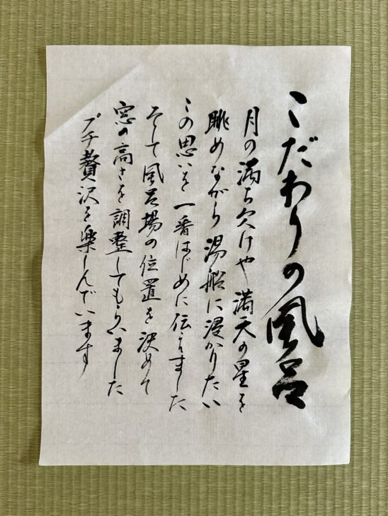 今回、性能やこだわりについて桶市さんから学んだことを、たくさん書にしたためました。家の随所に貼って、来客にも楽しんでいただいています。