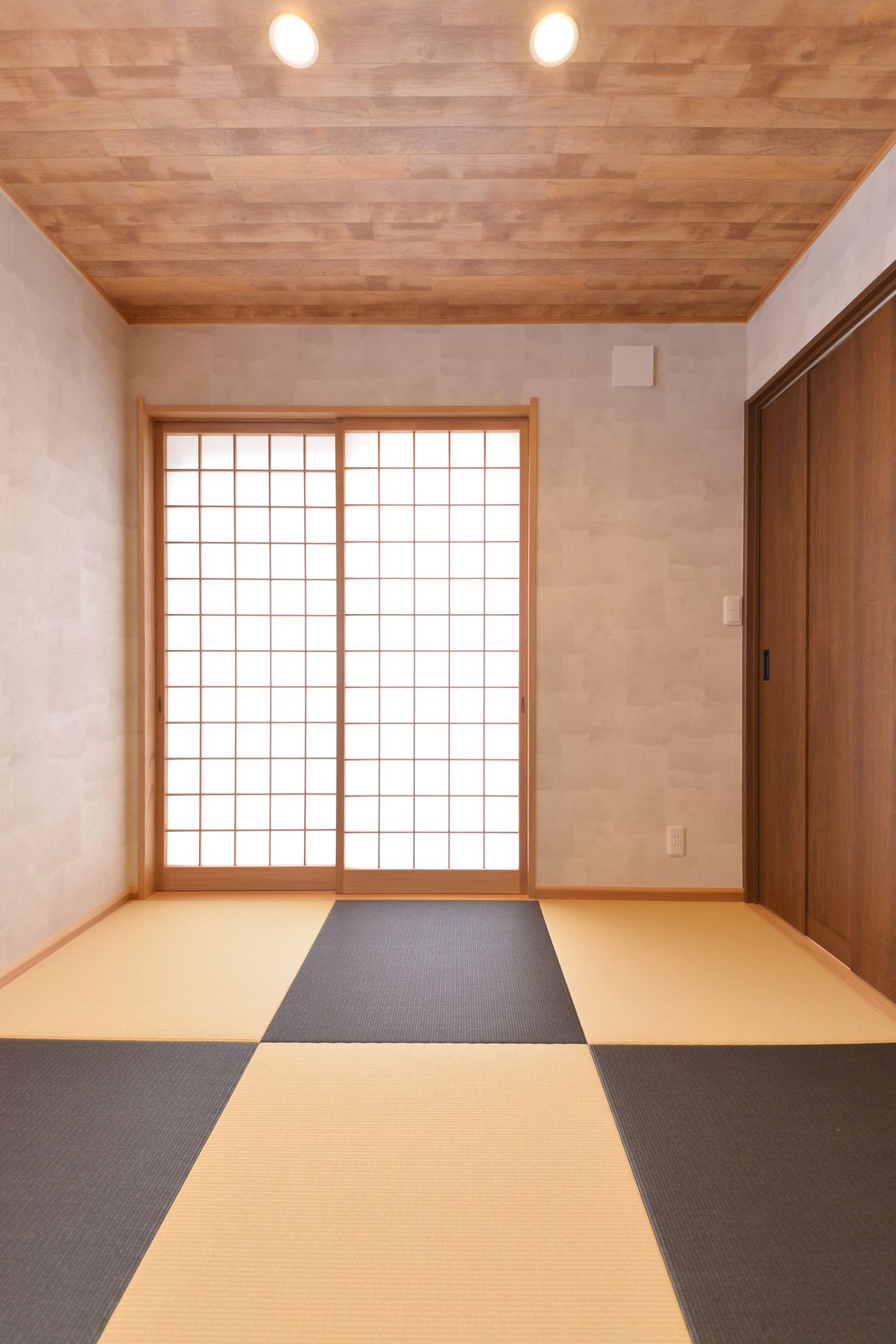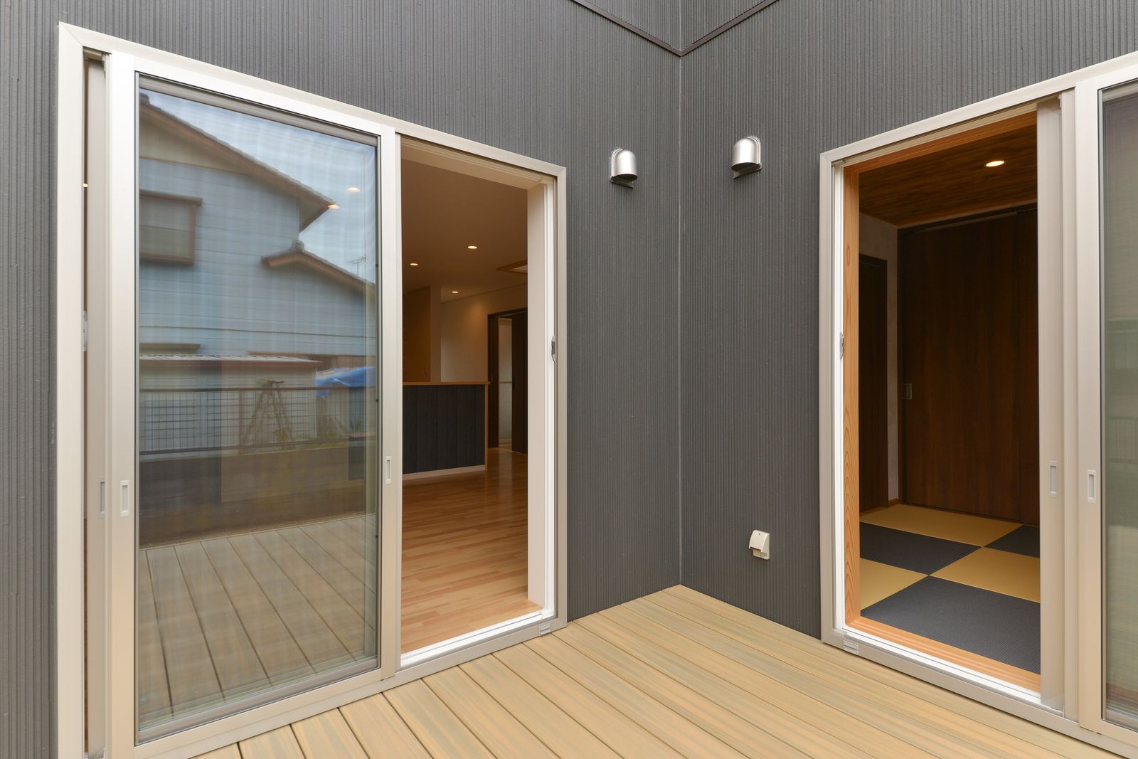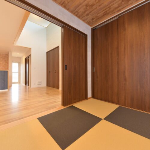 大きな吹き抜けのリビング。スカイブルーの壁紙とウッド調のシーリングファンが素敵です。海が近い家を感じさせてくれますね。モダンな和室も障子が素敵です。6帖もある大きなウッドデッキ。